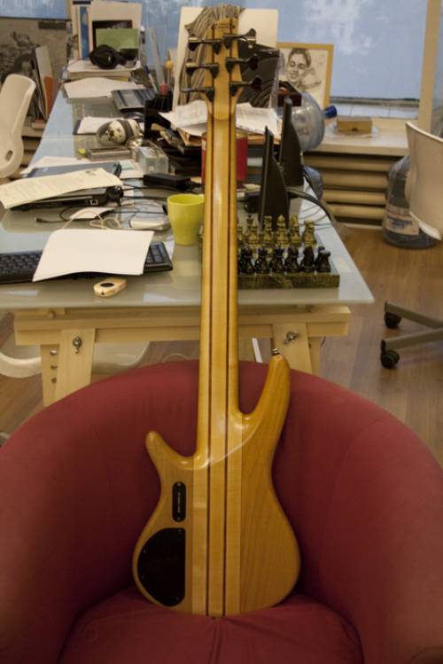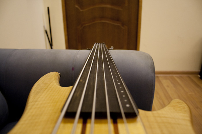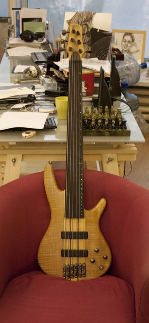 Накладка на гриф была заменена Александром Лучко, одним из лучших бас мастеров в области именно "деревянной" части. Теперь накладка из самого крепкого черного дерева. Разметка ладов по нижней стороне грифа маленькими точками, 3-й, 5-й, 7-й и так далее лады омечены точками чуть крупнее.
