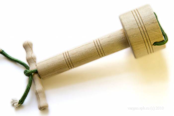 Деревянная рукоятка предназначена для более удобного держания варгана, который жестко крепится к ней закручивающимся шнуром. Для инструментов с большим диаметром основания рамы.