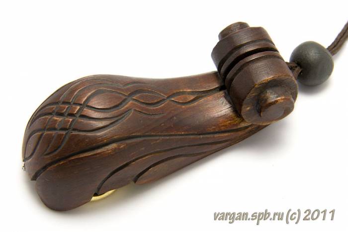 Футляр несет в себе тепло сибирского кедра, аромат воска. Инструмент органично, как бабочка с куколкой, слит с ним и закрепляется оригинальным замком из кожи и бусины. На нем изображен Ульзя - старинный знак Вечности Бытия.</i>