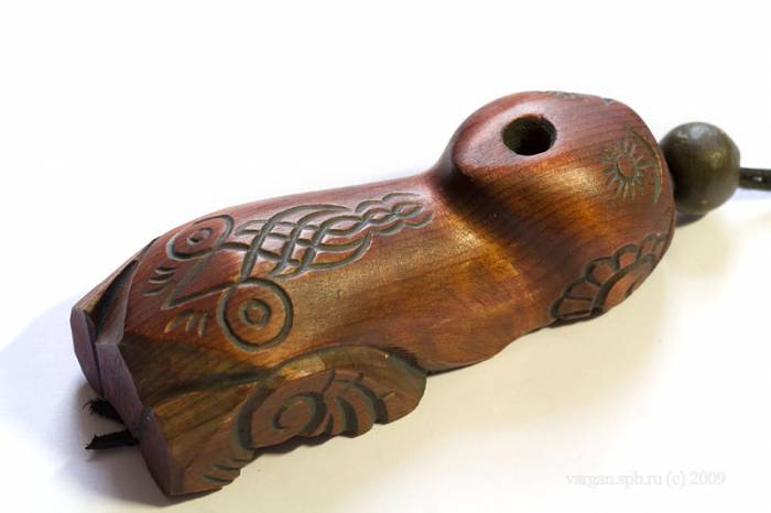 <i>Сирин - одна из трех (Сирин, Феникс, Алконост) райских птиц на Древе Жизни. Сирин поет песню радости, зачаровывая своим пением все недоброе, лишая его злой силы. Для славян он всегда был "синей птицей" удачи, которая осеняет своим крылом только по-настоящему счастливых людей. Образ любимого славянами Сирина органично соединился с алтайским комусом. Вместе поют они песню радости и надежды. На футляре изображен Ульзя - старинный знак Вечности Бытия. Замок из кожи скреплен символом Веры - бусиной.</i>