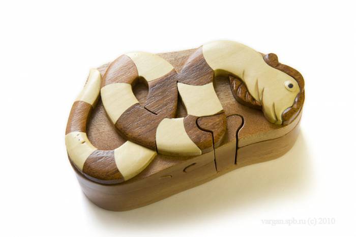 Футляр-шкатулка "Змея" из ценных пород дерева с объемной инкрустацией мозаикой (техника маркетри XVI в). Каждое изделие уникально и содержит оригинальную систему крепления крышки. Один из лучших вариантов упаковки подарка!