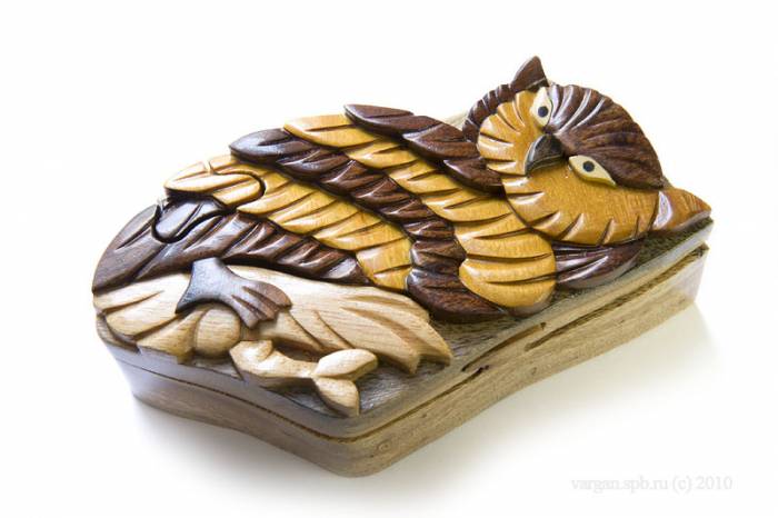 Футляр-шкатулка "Сова" из ценных пород дерева с объемной инкрустацией мозаикой (техника маркетри XVI в). Каждое изделие уникально и содержит оригинальную систему крепления крышки. Один из лучших вариантов упаковки подарка!