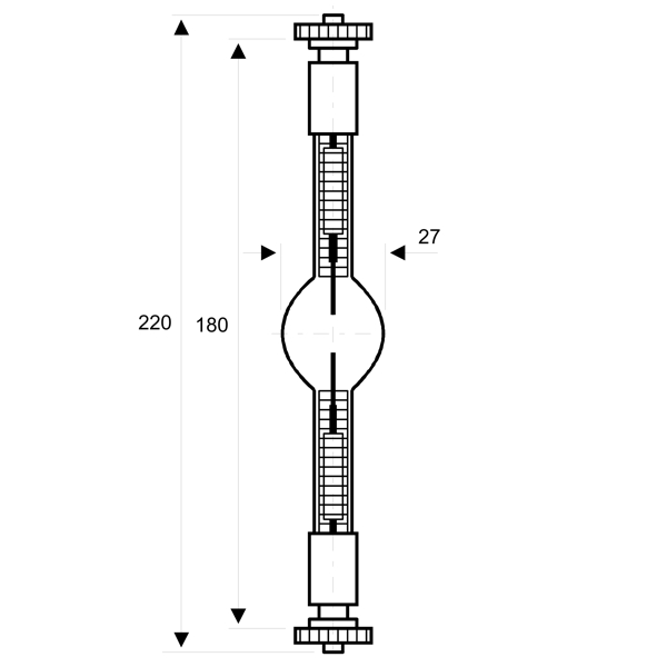 OSRAM HMI 1200W/DXS – двухцокольная металлогалогенная газоразрядная лампа с очень короткой дугой и высоким индексом цветопередачи. Лампа характеризуется большой яркостью, средним сроком службы 1000 часов, а также стабильностью цветовой температуры на протяжении всего срока эксплуатации. Имеет возможность повторного запуска из горячего состояния. Питание лампы может осуществляться от электромагнитного или электронного балласта.