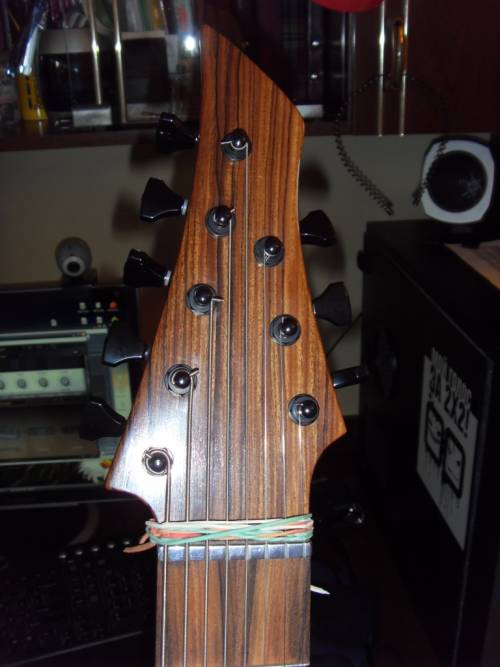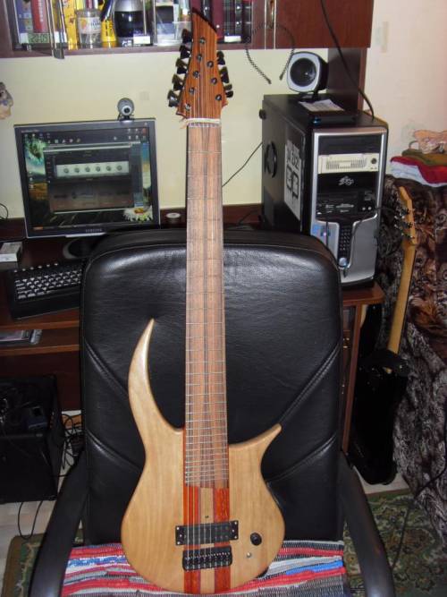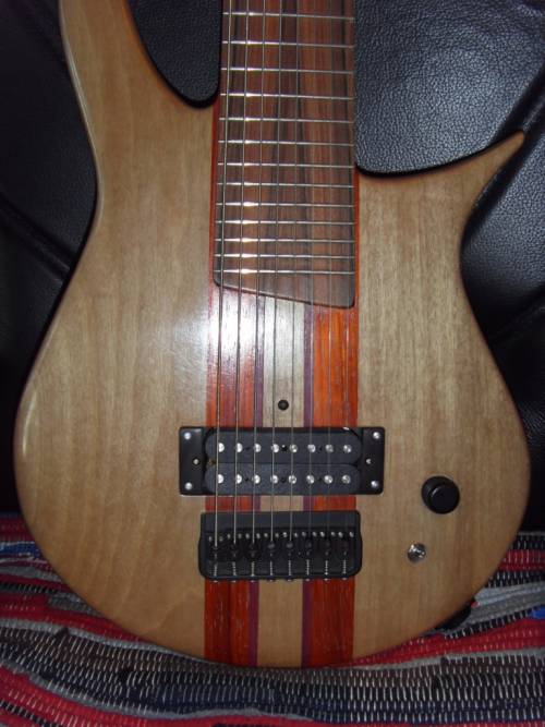 По звучанию. Гитара для любителей пониженных строев и творчества а-ля Meshuggah. Установленный датчик Lundgren m8 выдаёт очень схожий звук с гитарами Meshuggah. Так же гитара отлично подходит любителям теппинга. На датчике стоит "отсечка" что хорошо используется в соло партиях. В данный момент строй гитары спущен на полтона (F). В деке гитары присутствуют полости, добавляющие объёмность звучания.