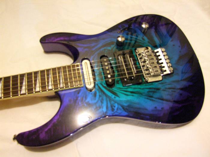 электрогитара, цвет синяя графика, корпус ольха, крепление грифа - на болтах, накладка на гриф - полисандр, звукосниматели Seymour Duncan® humbucking (бридж) и 2 single-coil (в средней и нэковой позиции - SD STK-S2 Hot Stack), флойд роуз Jackson® low-profile double-locking, черная фурнитура