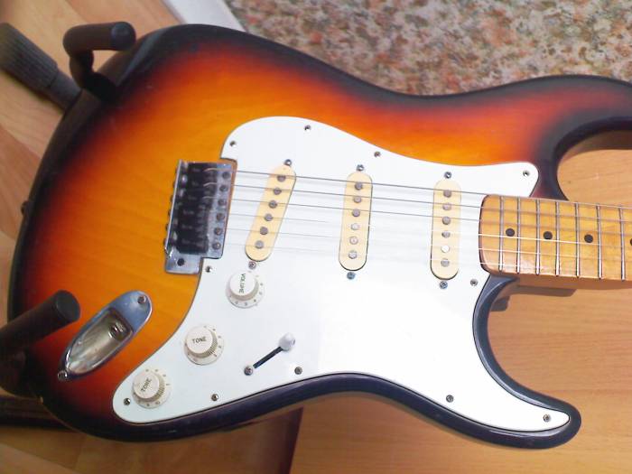 Электроника - 3 оригинальных сингла, трёхпозиционный переключатель, громкость. Тон не работает, видимо надо поменять конденсаторы или проверить пайку. Но я всё равно им не пользуюсь.