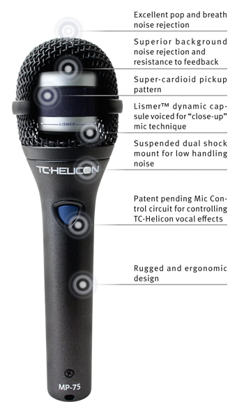 Микрофонное управление позволяет поддерживать связь между MP-75 и устройствами вокальных эффектов - в том числе VoiceLive 2, VoiceLive Touch, VoiceLive Singles и VoiceTone продукции с USB – с помощью всего одной кнопки на микрофоне. В таких продукциях, как VoiceLive 2 и VoiceLive Touch, кнопка настраивается пользователем, что позволяет осуществлять микрофонное правление с учетом ваших предпочтений. Вдобавок, через обновление прошивки, любым вокальным процессором эффектов от компании TC-Helicon можно управлять с помощью функции микрофонное управление устройства. Обновления доступны через VoiceSupport.