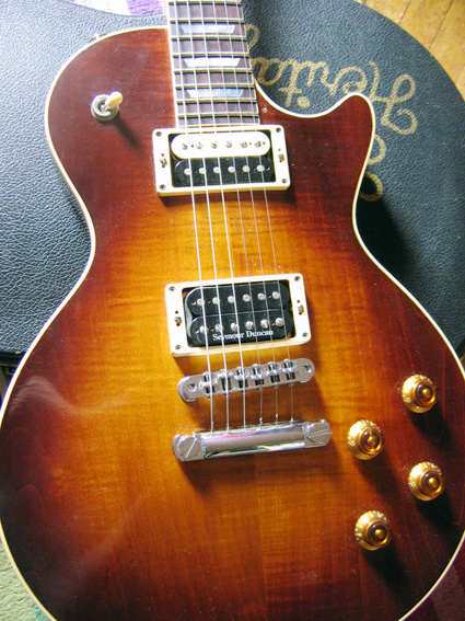 Продается Les Paul Heritage 150 CM. США, Каламазу. 1998 год. Редкая в наших широтах гитара. Привез в 2006-м году из америки. Профиль грифа близок к 60 раундед. Замечательный, насыщенный гармониками звук на перегрузе и чистом звуке. Прекрасный сустейн. Косметическое состояние на 4+. Все исправно работает. Дека красное дерево+кленовый топ, гриф красное дерево, мензура 24.75. Новые лады (менялись год назад). Костяной порожек. Звучки - сеймуры (бридж SH4, нек SH1). Были сменены колки и бридж на Gotoh (колки по причине неисправности старых). В комплекте фирменный кейс Heritage.