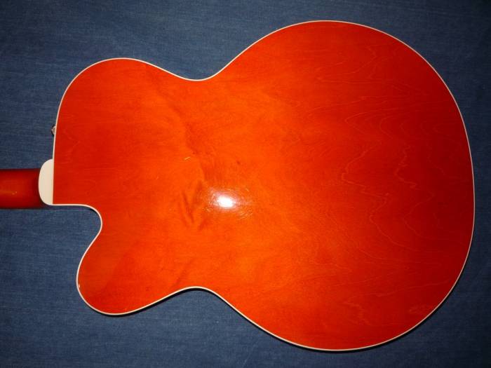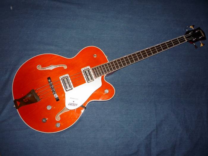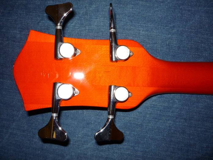 Имиджевая полуакустическая бас-гитара. Выглядит очень стильно и позитивно. Звучание весьма специфическое, но очень плотное, насыщенное. Слэпом на этом инструменте не поиграешь, но если вы играете рокабили или рок-н-ролл - это ваш инструмент. Корпус - клён, оранжевая тонировка с полиуретановым лаковым покрытием. Гриф - клён, накладка - палисандр. 22 лада, радиус 12", мензура 30,3". Звукосниматели: 2 хамбаккера Filter'TronTM. Регуляторы громкости и тембра. Фурнитура хром: колки Gotoh, струнодержатель Adjustable 4-Saddle Bridge.