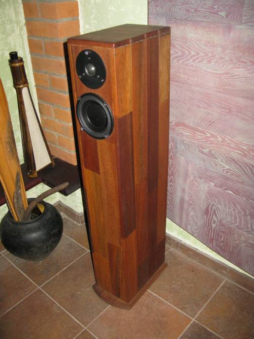 Уникальные АС. При изготовлении большое внимание уделялось жёсткости и массе корпуса. Он изготовлен из массива древесины балау (индонезия), изнутри – 20-мм слой армированного бетона (!) с добавлением мраморной крошки. Благодаря массе и внутреннему ребру жёсткости, корпус беспрецедентно инертен. Все наружние грани корпуса скруглены для снижения рефракционных искажений. Имеется возможность установки на шипы (три или четыре), но можно и без них – разницу уловить очень трудно. Фазоинвертор находится на задней панели, края скруглены, чтобы снизить призвуки. Клеммы для подключения позолоченные, хорошие. На каждой колонке по две пары клемм для Bi-wiring, но задействована только нижняя пара, т.к. эти АС звучат лучше в подключении одним кабелем.