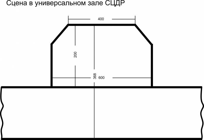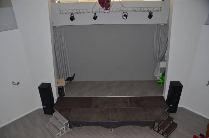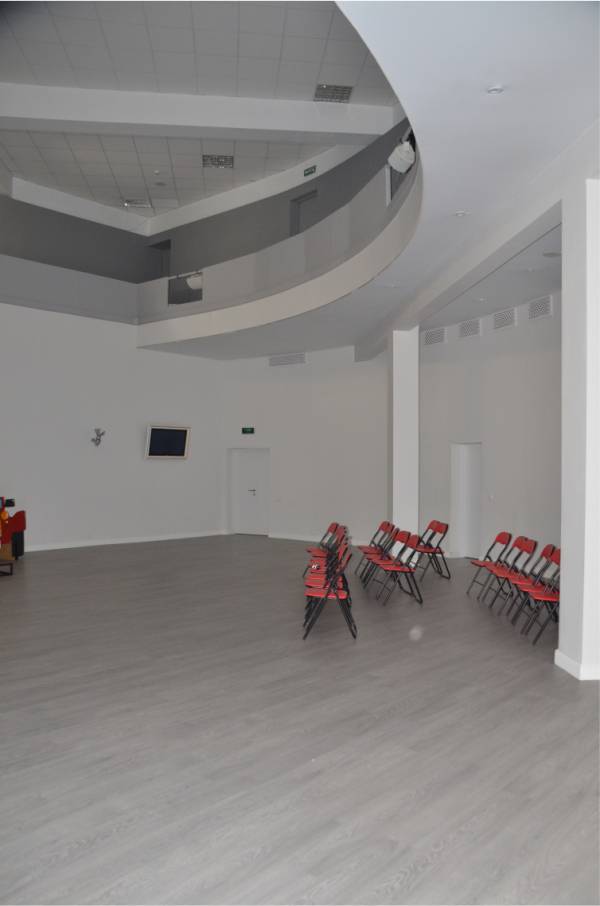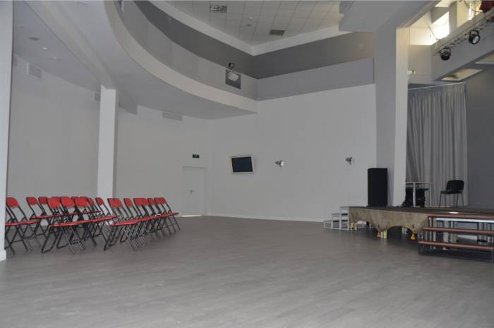 сценой, репетиционным светом и звуком. Две гримерные комнаты с душем. Площадь